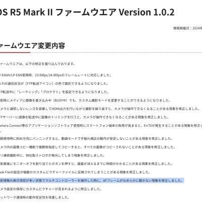 Canon EOS R5 Mark IIの最新ファームウェアVersion 1.0.2、AFフレームの”カクツキ”を修正