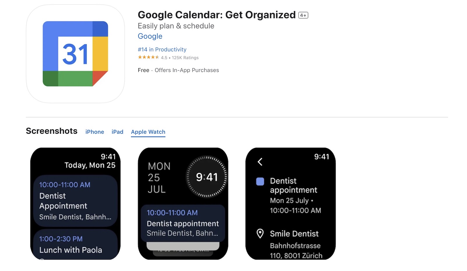 各カードには予定時刻、イベントやタスクのタイトル、関連する場所が含まれている。アイテムをタップすると追加のイベント詳細が表示されるが、現時点ではApple Watch上での予定の作成や編集には対応していない。アプリ内のメッセージでは、詳細を確認するためにiPhone版Googleカレンダーアプリを開くよう促している。