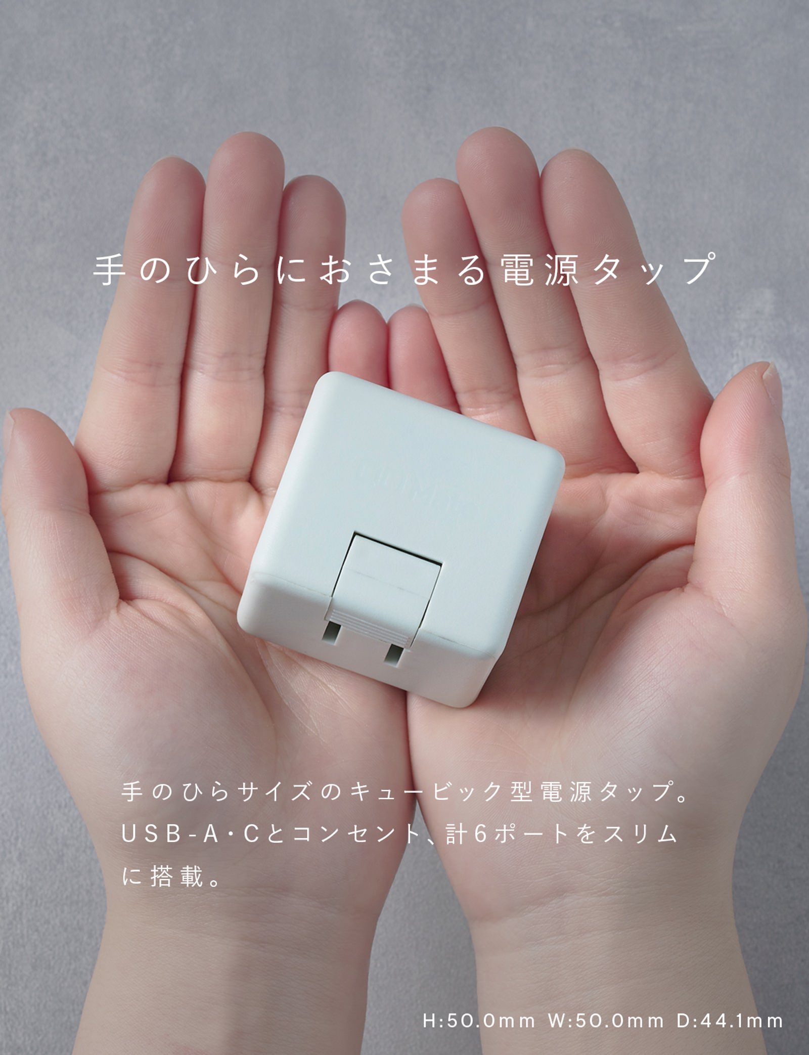 本体サイズは約50×50×44.1mmと手のひらサイズで、デスクやリビング、寝室など様々な場所で活用できる。愛嬌のあるサイコロ形状は、従来の電源タップとは一線を画すデザイン性を実現している。