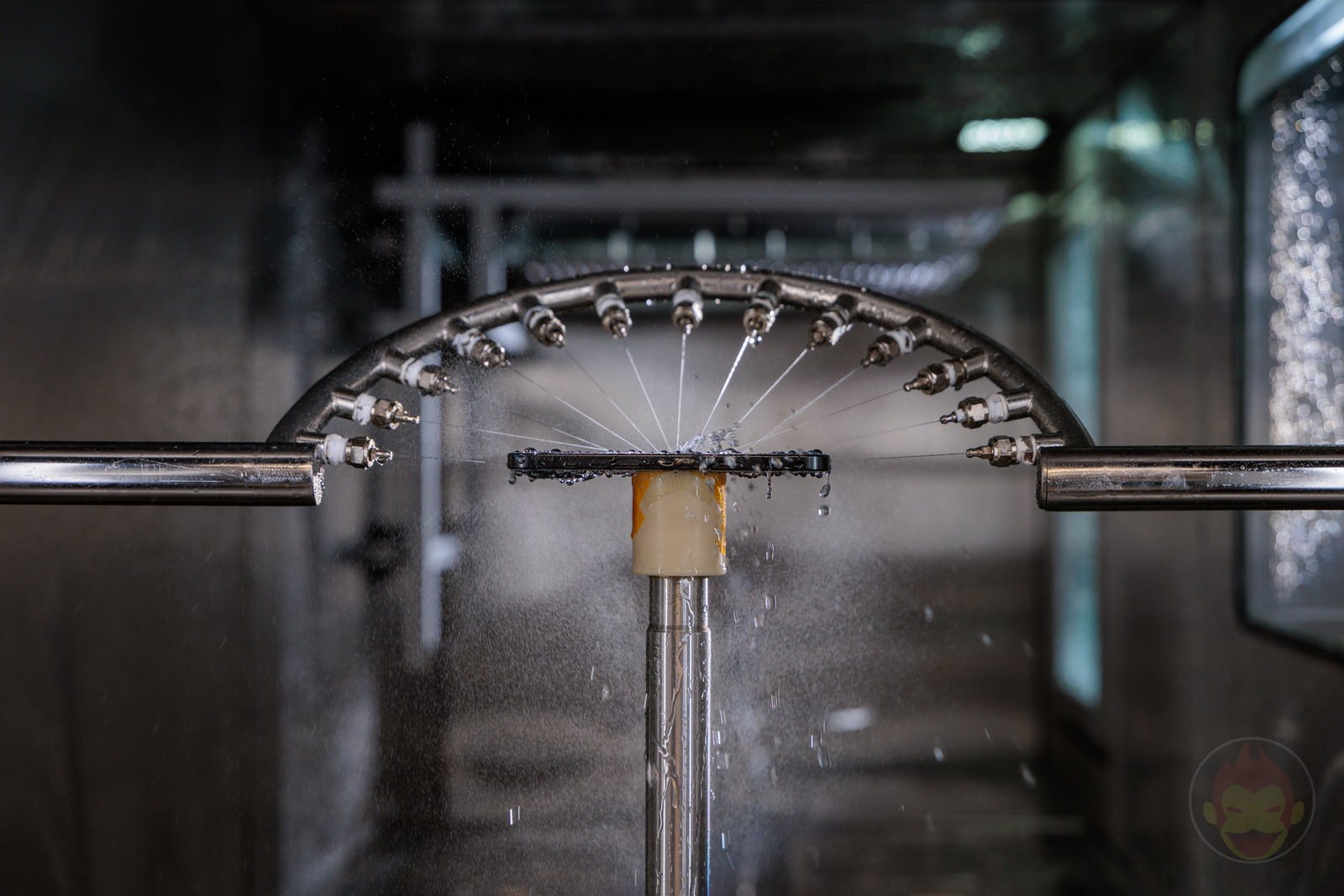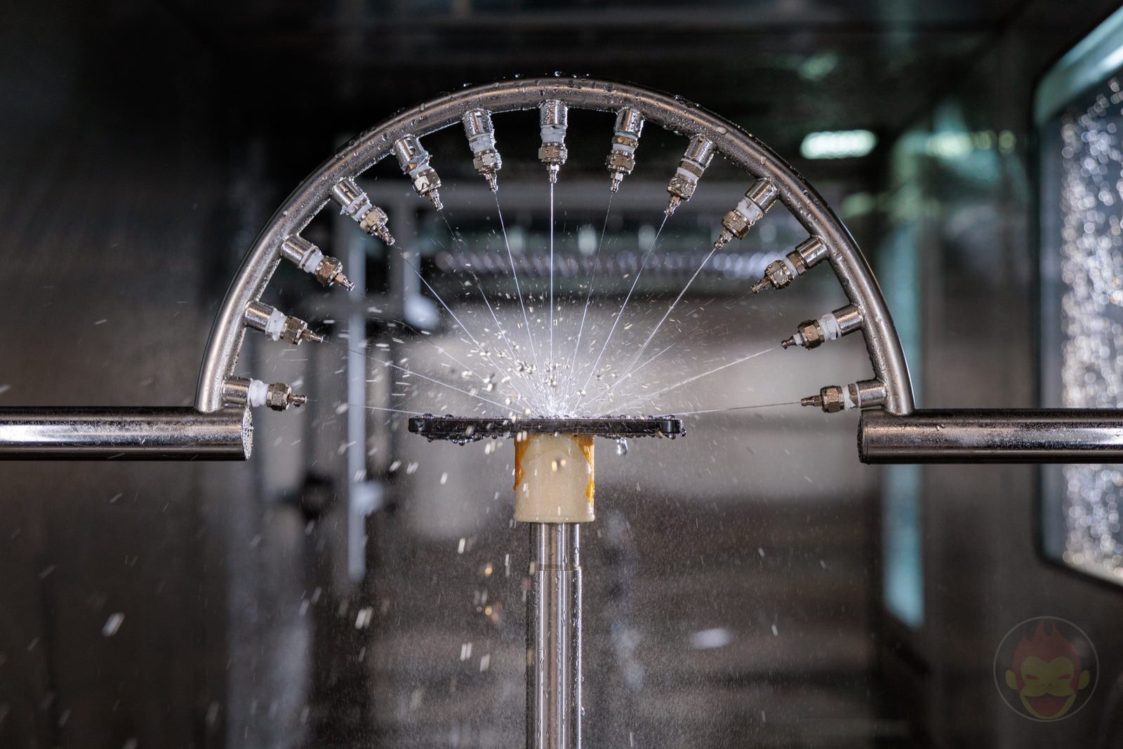 このテストでは、製品を滴下トレイに置き、実際の雨を科学的に再現した水を噴霧する。圧力はほとんどかけられておらず、日常的に遭遇する可能性の高い軽微な水の接触に対する耐性を確認している。