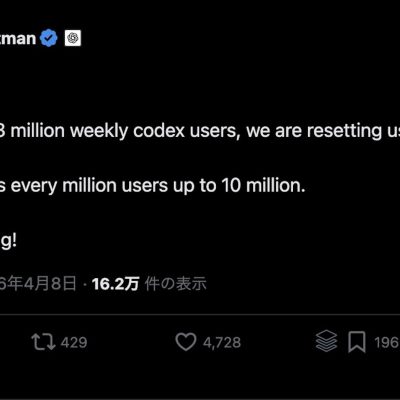 OpenAIの「Codex」、週間ユーザー300万人突破で使用制限リセット。100万人増えるごとにリセットしてくれるらしい