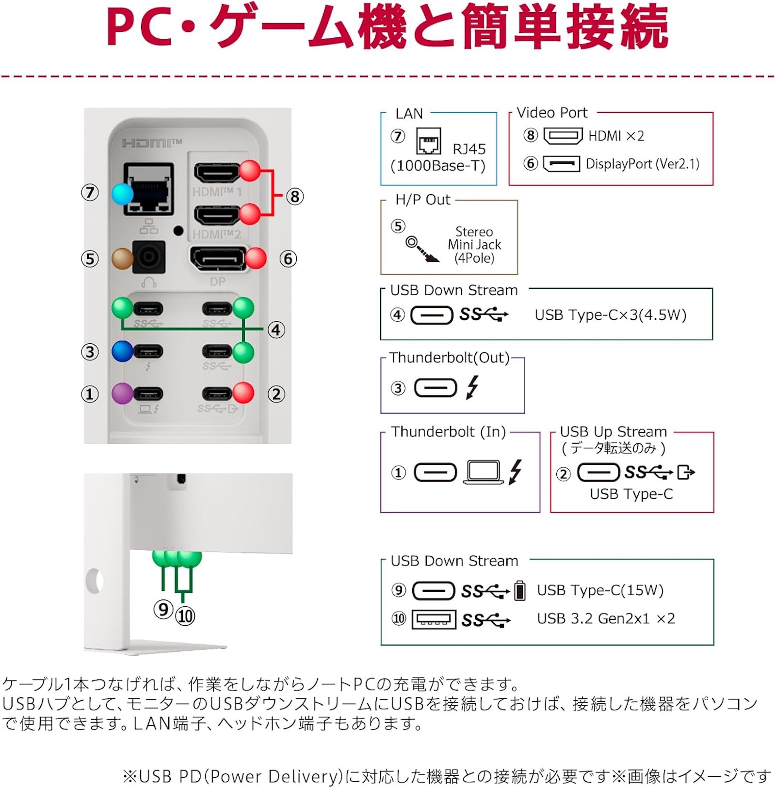 USBダウンストリーム端子として、USB 3.0の倍速となる10Gbps対応のUSB Type-C×4とUSB Type-A×2の計6ポートを搭載している。Thunderbolt経由でノートパソコンを接続するだけで、モニター表示・充電・周辺機器利用が同時に行える。