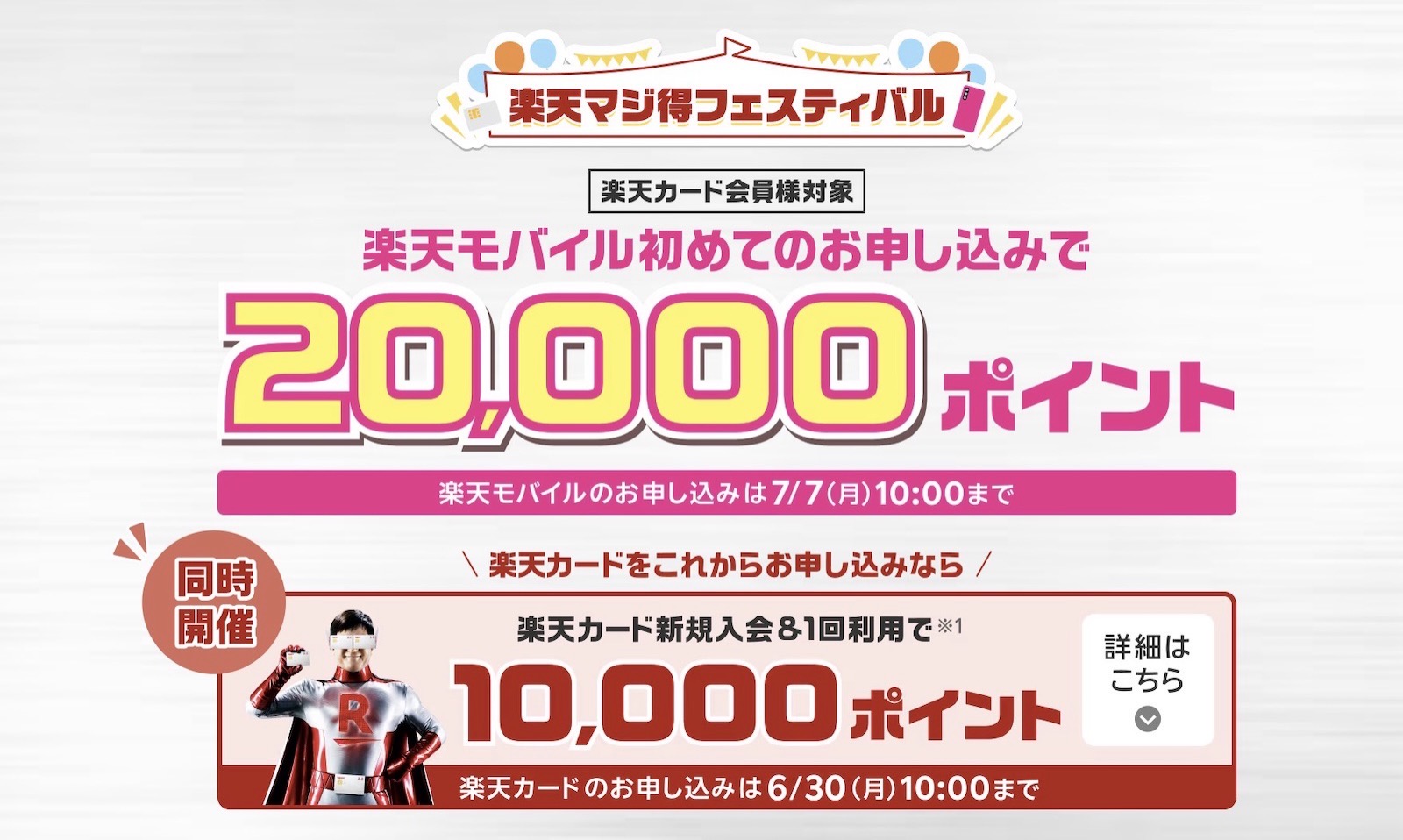 楽天カードを持っていないユーザーも、6月30日10:00までに新規入会と初回利用を行えば最大10,000ポイントが獲得できる。マジ得フェスティバルの20,000ポイントと合わせると、合計30,000ポイントという大きな還元が期待できる計算だ。
