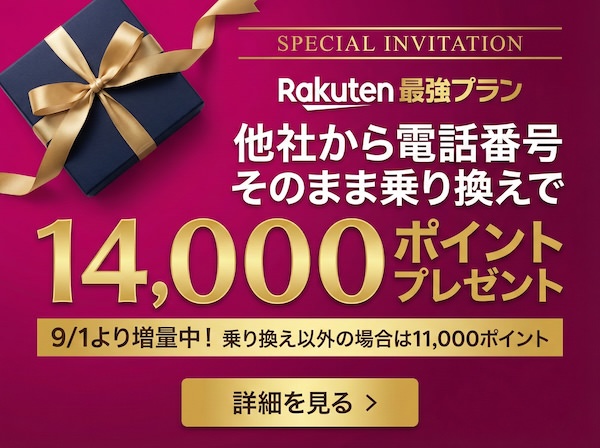 - 【Rakuten最強プランはじめてお申し込み特典】他社から乗り換えでポイントプレゼント(キャンペーンコード:2091)