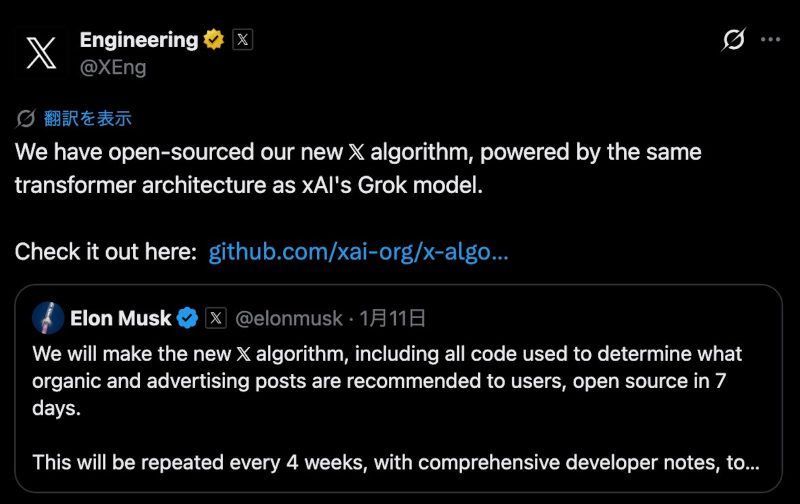 イーロン・マスク、Xの新アルゴリズムを7日以内にオープンソース化すると発表。でも2023年版は放置されたまま